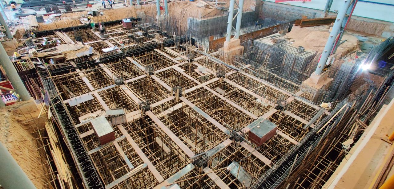 5月29日一大早,筆者來到豫聯(lián)集團下屬企業(yè)中孚高精鋁材公司第三臺冷軋機項目建設現(xiàn)場,看到近百名施工人員正在緊張有序地忙碌著,有的進行混凝土結構鋼筋綁扎焊接,有的進行混凝土澆筑模板安裝加固,有的進行預埋鋼襯板焊接校正,電焊機、鋼筋彎曲機、模板切割機等設備運行的聲音此起彼伏,到處是一派爭分奪秒、加快建設的繁忙景象。