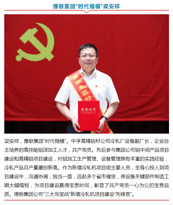 從進入企業(yè)起,梁安祥就決心在這個夢想開始的地方干出一番事業(yè)來。2007年,梁安祥被公司選派到羅馬尼亞進行鋁加工技術學習培訓,2008年結業(yè)回來后立即投入公司鋁中間產(chǎn)品項目建設,完成了美國、意大利等國進口設備生產(chǎn)線及附屬設備的土建施工和設備安裝監(jiān)督檢驗工作。2010年5月調入擴建指揮部,先后參與了“1+4”熱連軋機組、單機架和雙機架冷軋機組、切邊機組等設備的技術交流、標書編寫、工程進度和質量跟蹤等工作。看到高精鋁項目建成投產(chǎn),他心潮澎湃、激動萬分。