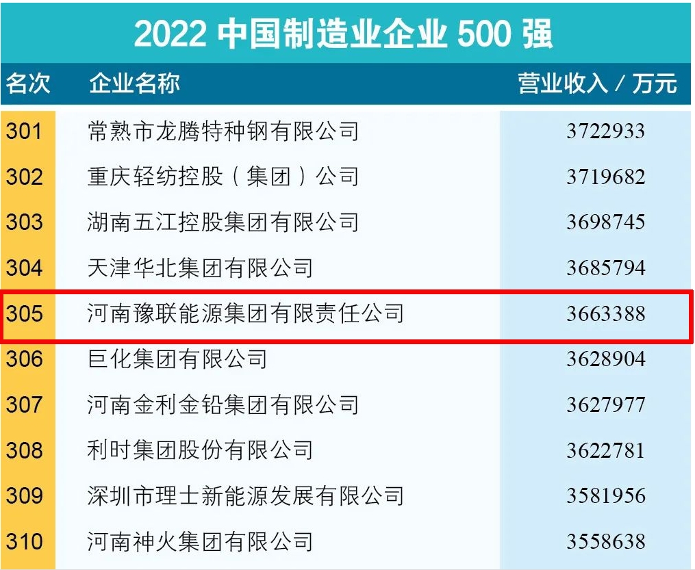 豫聯(lián)集團(tuán)上榜“2022中國制造業(yè)企業(yè)500強(qiáng)”