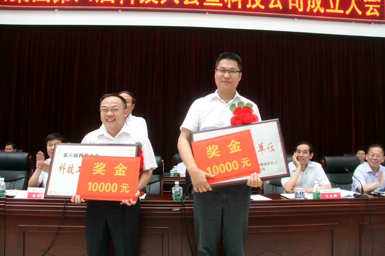 豫聯集團總經理助理、技術中心常務副主任鄒凱首先作了科技工作報告,全面回顧總結了公司2012年以來的科技創新工作,明確了科技公司今后兩年的科技創新目標、方向和重點任務。在歡快的樂曲聲中,獲得獎勵的先進單位代表及先進個人胸戴紅花、喜氣洋洋地上臺領獎,全場響起陣陣熱烈的掌聲。岳海濤、王進良、朱云峰、王文輝、王永力、吳慕天等六位先進代表分別做了典型發言。豫聯集團總經理王元明宣讀了《關于成立河南中孚技術中心有限公司及人員聘任的通知》。