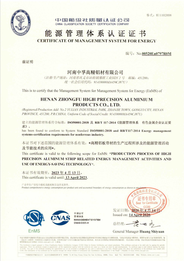 近日,中孚高精鋁材公司收到了中國船級社質量認證公司頒發的《能源管理體系認證證書》,標志著公司建立的能源管理體系符合標準ISO50001:2018及RB/T 117-2014《能源管理體系有色金屬企業認證要求》。